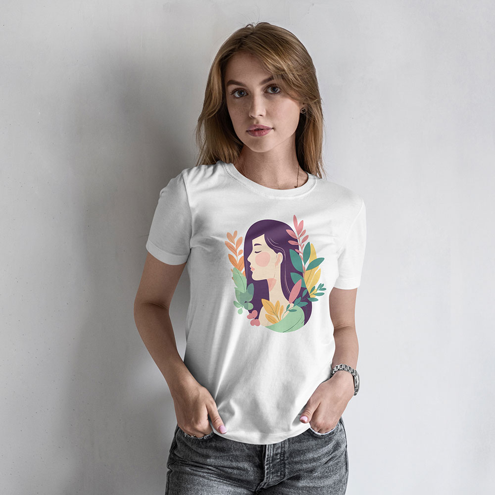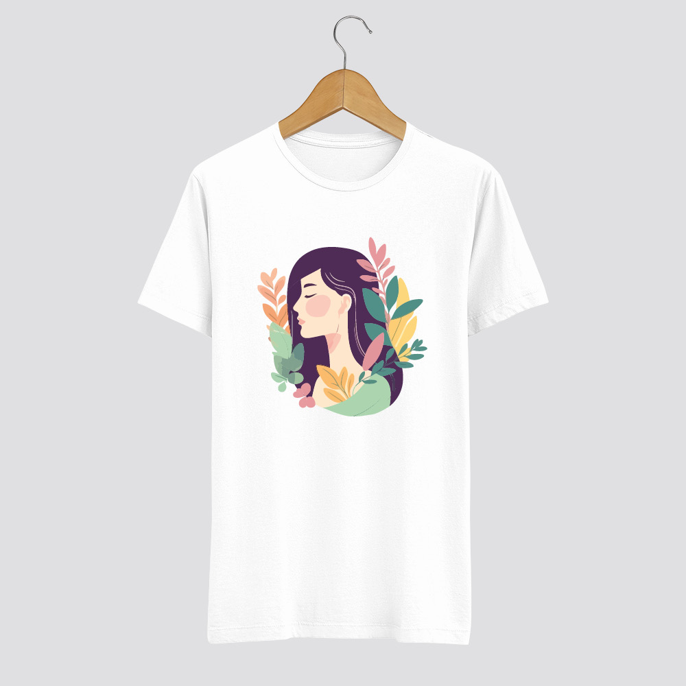 Ez a póló egy női arc békés körvonalait jeleníti meg, amit leveles ágak vesznek körül. A lágy színátmenetek és a természetes formák harmonikus képet alkotnak, megnyugvást és kiegyensúlyozottságot sugároznak. Az illusztráció stílusa finom és elegáns, a visszafogott színpaletta pedig bármilyen szetthez jól illeszkedik.