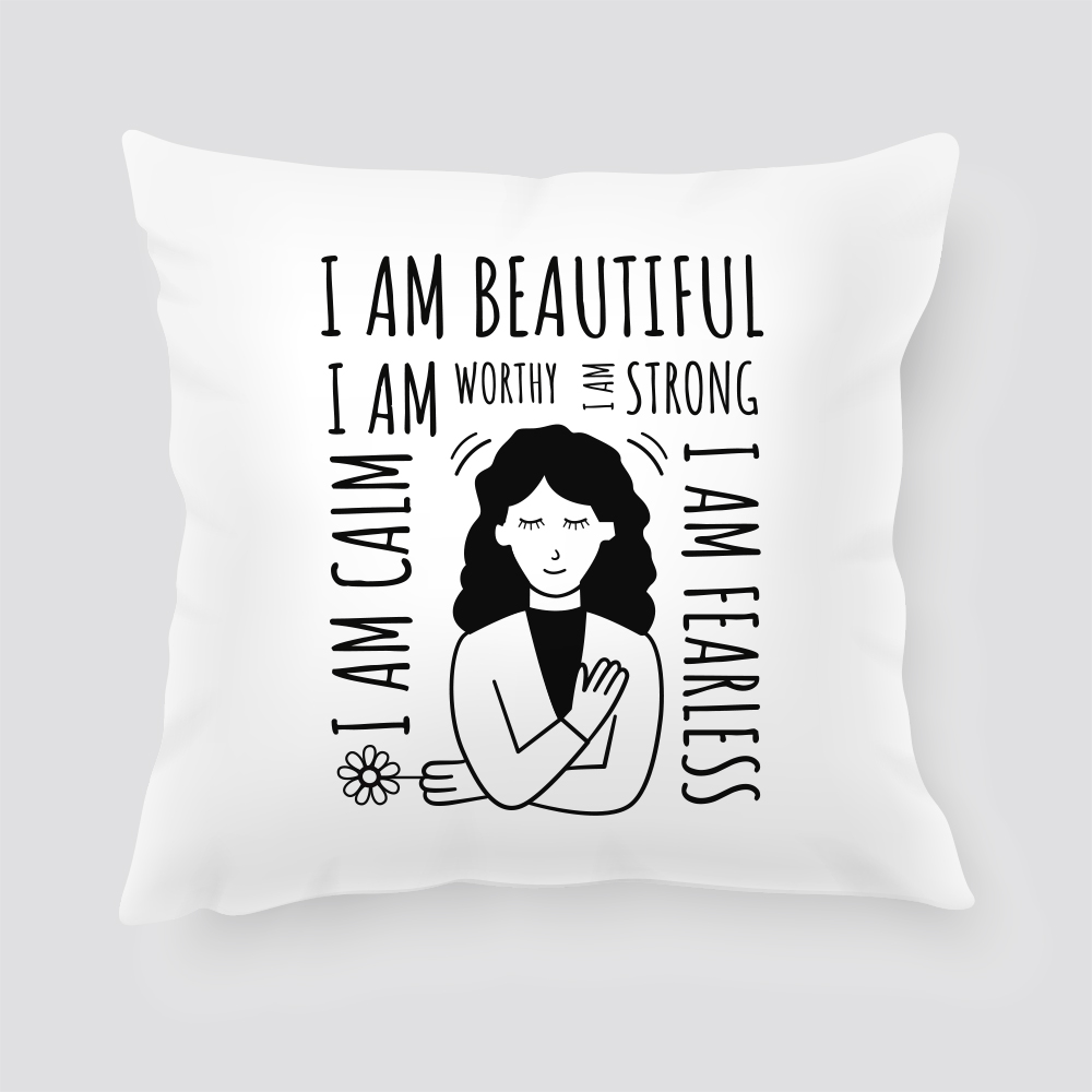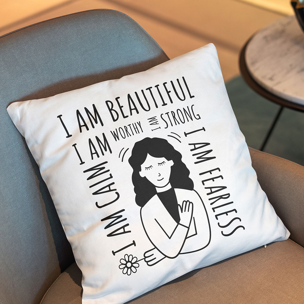 A letisztult fekete-fehér dizájn és a központi karakter, a nyugalom és önbizalom megtestesítőjeként, erőteljes vizuális hatást kelt. Ez a párna tökéletes választás lehet azok számára, akik egy inspiráló, pozitív gondolatokkal teli tárgyat szeretnének maguk körül tudni otthonukban. #belsőerő #önelfogadás #inspiráció #affirmáció #feketefehér #önbecsülés #nyugalom #bátorság
