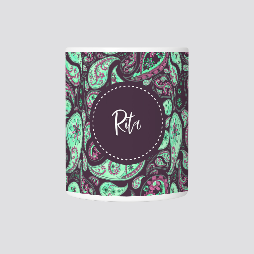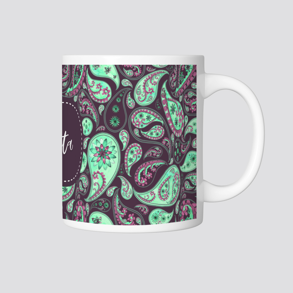 Boho mintás névnapi bögre keleti ornamentikával, menta és sötét lila színkombinációval. EGYEDI FELIRATTAL! Az Egyedi felirat mezőbe kérjük add meg, milyen nevet írjunk a bögrére. A keresztneves bögrével kreatívan ajándékozhatsz.