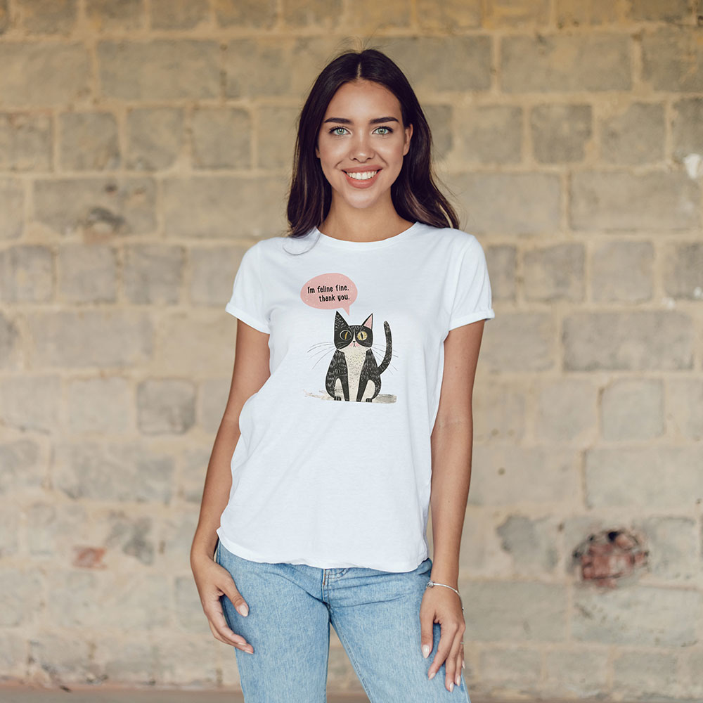 Cicás póló „I’m feline fine, thank you.” felirattal. A karakteres, texturált illusztráció és a szellemes szövegbuborék mosolyt csal az arcra, miközben a grafika egyszerű, de szerethető vonalvezetése egy laza, mindennapi viseletet garantál. Ideális darab az állatbarátok számára, vagy bárkinek, aki szeretné egy kis játékossággal fűszerezni a napját.