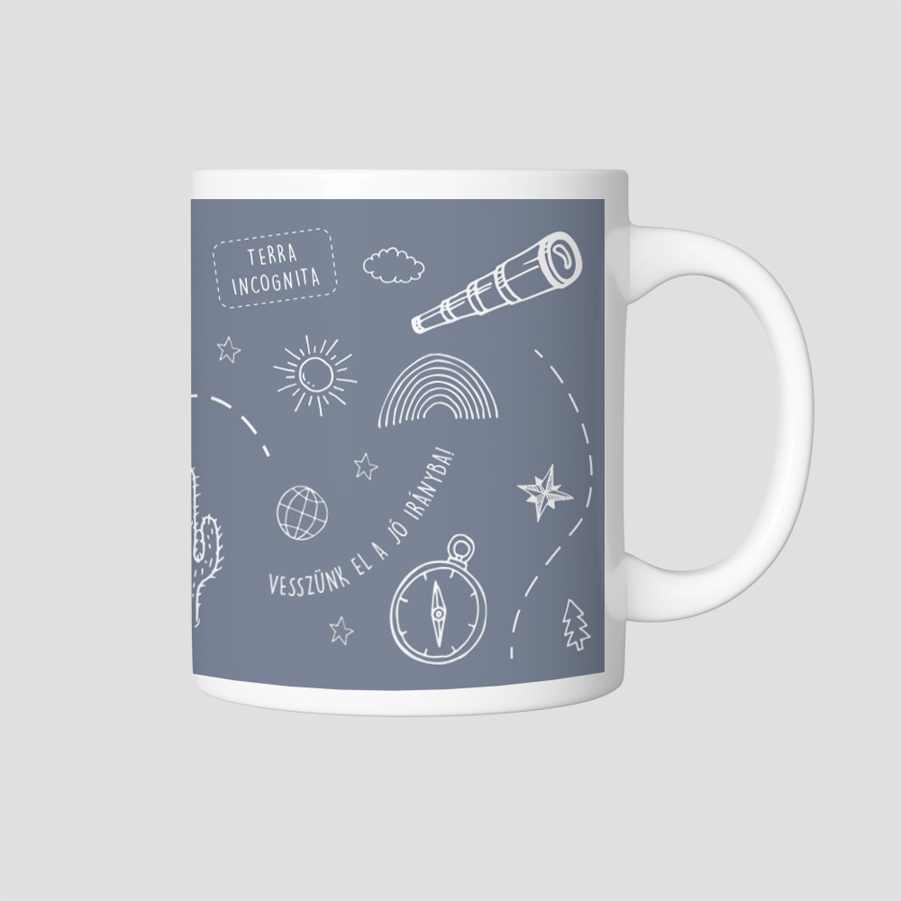 A mintában fehér alapon fekete vonalrajzokban távcsövek, iránytűk, csillagok, nap, szivárvány és felhők jelennek meg, amelyek a földrajz, nagyvilág és az utazás szépségeit, szimbólumait jelenítik meg. Ez a könnyed dizájn tökéletes választás azoknak, akik szeretik a Föld szépségeit, a kalandokat és az új helyek felfedezését. Egy tökéletes ajándék a földrajzi csodák, felfedezések szerelmeseinek.