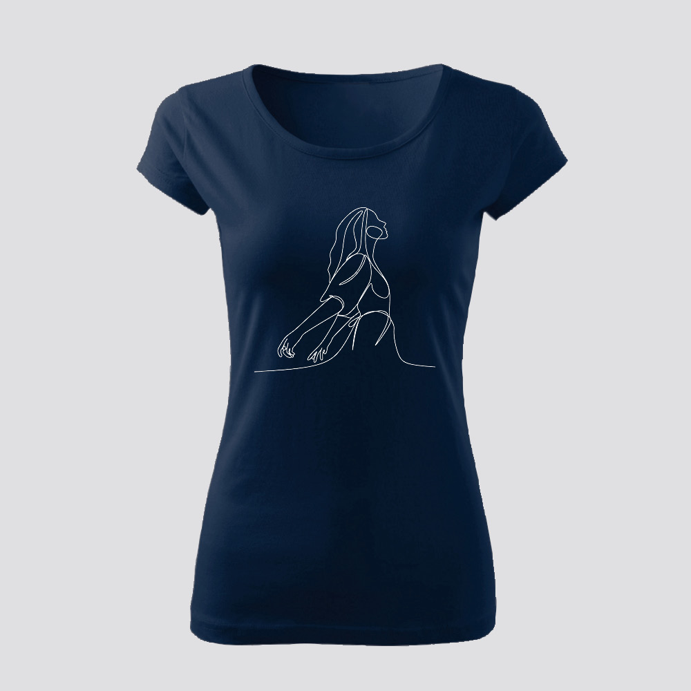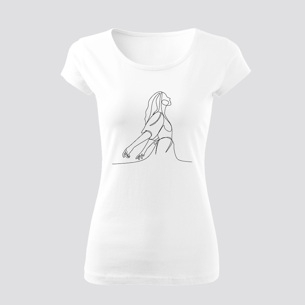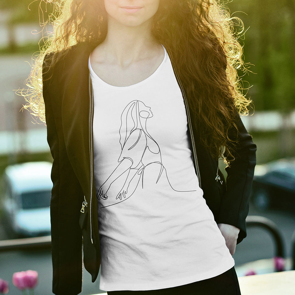 A minimalizmus és az elegancia találkozása ebben az egyvonalas pólóban, ami egy felszabadult női alakot ábrázol. A vonalvezetés folytonossága és a minimalista ábrázolás letisztult megjelenést ad.