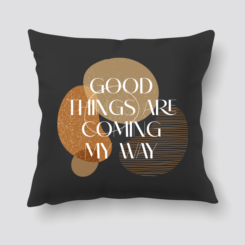 Ez a díszpárna a modern absztrakt minimalizmust és a pozitív gondolkodást ötvözi. A geometriai formák és az aprólékosan megtervezett textúrák egy dinamikus, de mégis letisztult kompozíciót alkotnak, amely az optimista „GOOD THINGS ARE COMING MY WAY” üzenettel válik teljessé. A földszín árnyalatok és a vizuális textúrák tökéletesen tükrözik a Bauhaus design filozófiáját, amely az egyszerűségben és funkcionalitásban rejlik, miközben a modern tipográfia kifinomultságot ad a dizájnhoz. #pozitívjövőkép #absztraktminimalizmus #bauhausdesign #díszpárna #letisztultszépség #tipográfia #modernotthon