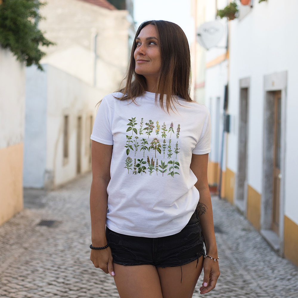 Természetbarát póló gyógynövény katalógussal, zöld tónusokkal, részletgazdag ábrázolással, gyógynövény ismeret, növényrajz, botanikai illusztráció