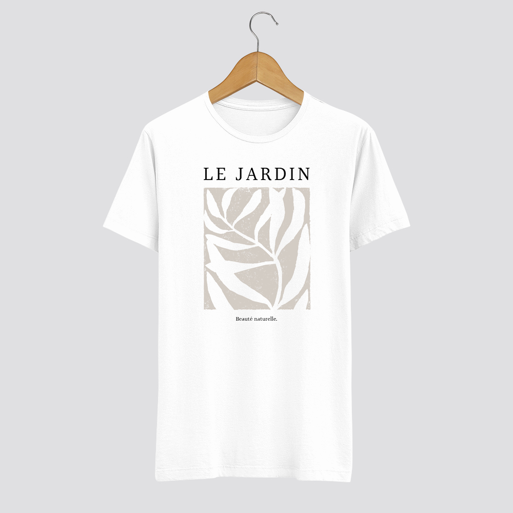 A „Le Jardin” feliratú női póló letisztult levél mintájával egyesíti a természeti inspirációt és a modern minimalizmust.