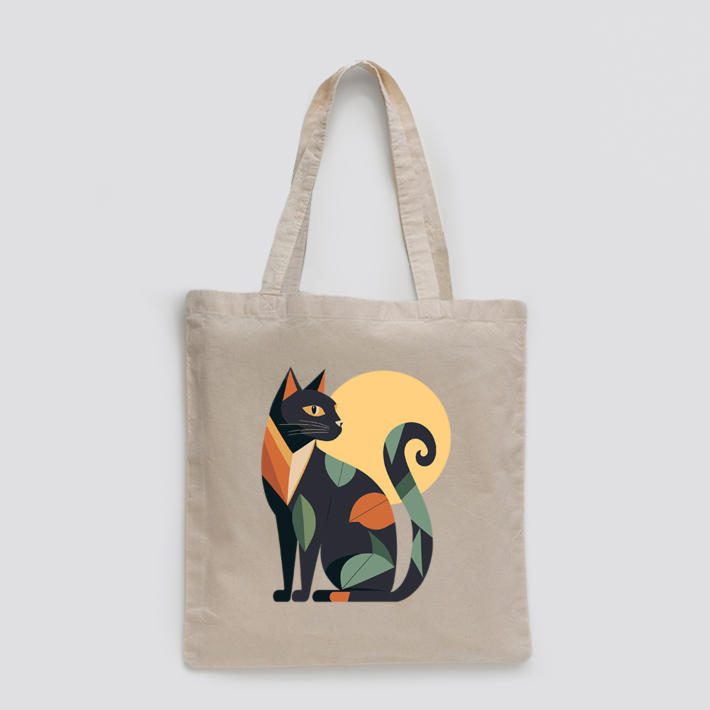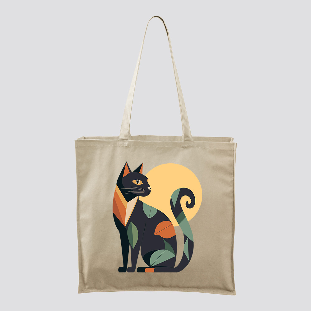 Macskás vászontáska meleg színekkel, letisztult geometria formákkal, stilizált növényi motívumokkal. Harmonikus megjelenés. Cica rajongóknak kifinomult választás.