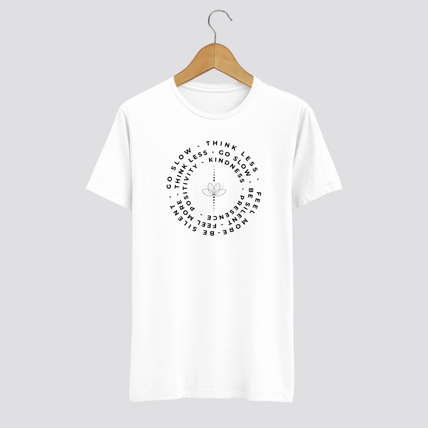 Merülj el a nyugalom és a belső békesség világában ezzel az inspiráló pólóval, amelyet a mindfulness és a slow life filozófiájával terveztünk. A póló középpontjában egy letisztult lótuszvirág sziluett áll, körülötte körben elrendezett, motiváló szavakkal: „Go slow”, „Think less”, „Be kind”, „Feel more”. Ez a design tökéletes választás mindazok számára, akik értékelik a tudatos jelenlétet és a mentális nyugalmat.