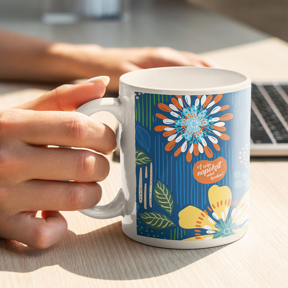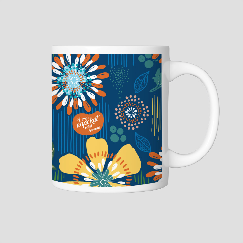 Ez a bőgre a hűs kék éjszakai égbolt alatt színpompás virágokat varázsol otthonodba. A sötét alapon a sárga és narancssárga virágok életre keltik a design-t, míg a finom zöld levelek és kiegészítő elemek egy harmonikus természetes hátteret nyújtanak mindehhez. A stílusos és egyedi mintázat egy népi motívumokkal átitatott design-t tükröz, amely minden teázás vagy kávézás alkalmával elvarázsol.  #éjszakaikert #virágminta #modernnépművészet #kék #színesdesign #bögrekollekció #stylishkitchen #növényimotívumok #dekoratívbögre #ajándékanyukáknak